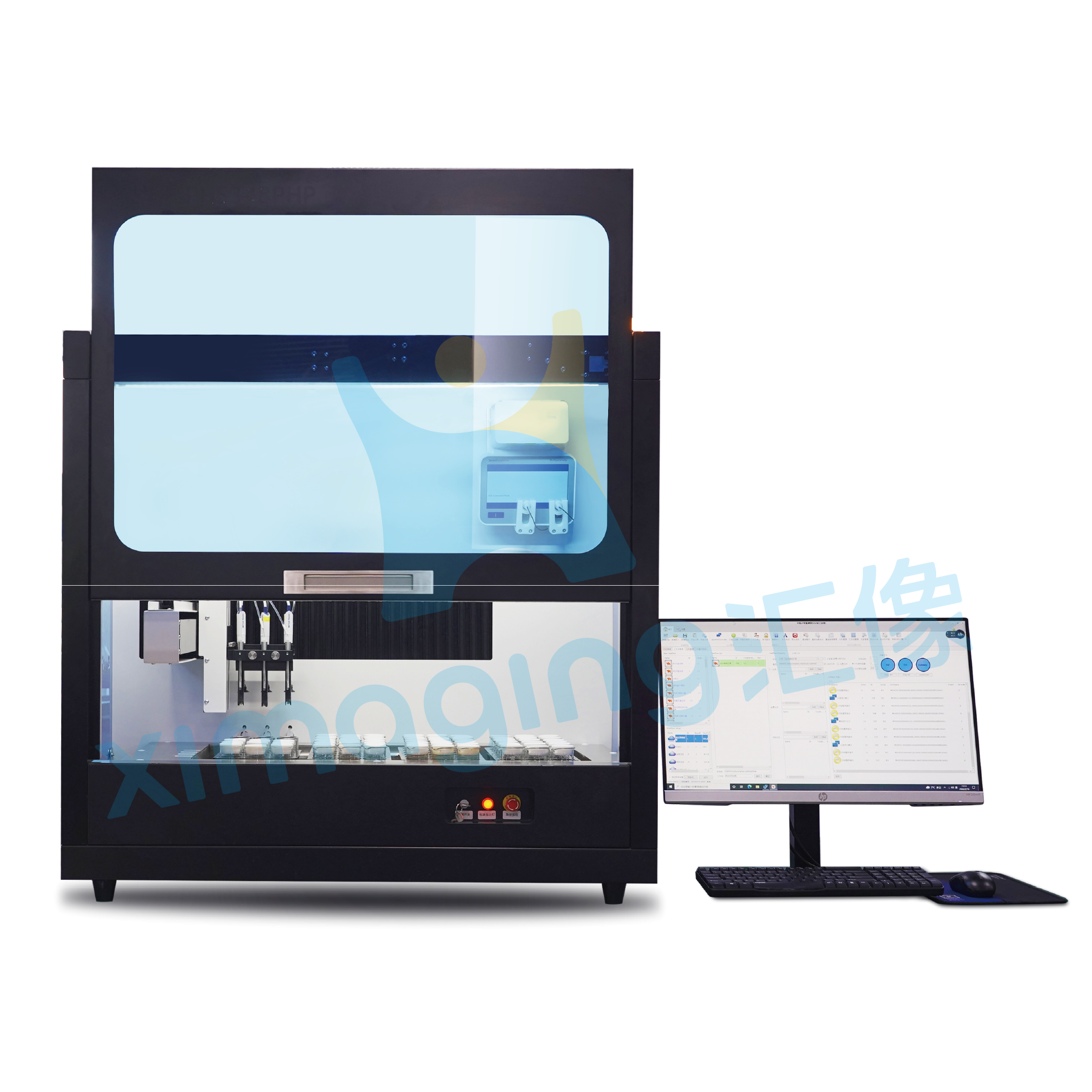 協作機械臂自動對樣品瓶開蓋,三個加液通道同時工作。